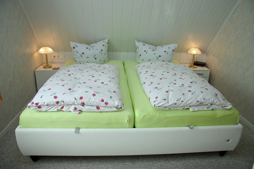 Das Schlafzimmer ist ausgestattet mit einem Doppelbett mit getrennten Matratzen, Radiowecker und einem Einbau-Kleiderschrank.