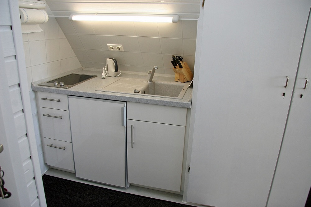 Es befindet sich im Wohnzimmerbereich eine Küchenzeile mit einem 2-Platten-CERAN-Kochfeld, Mikrowelle, Kaffeemaschine, Spüle, Kühlschrank und weiteren Elektro-Kleingeräten.